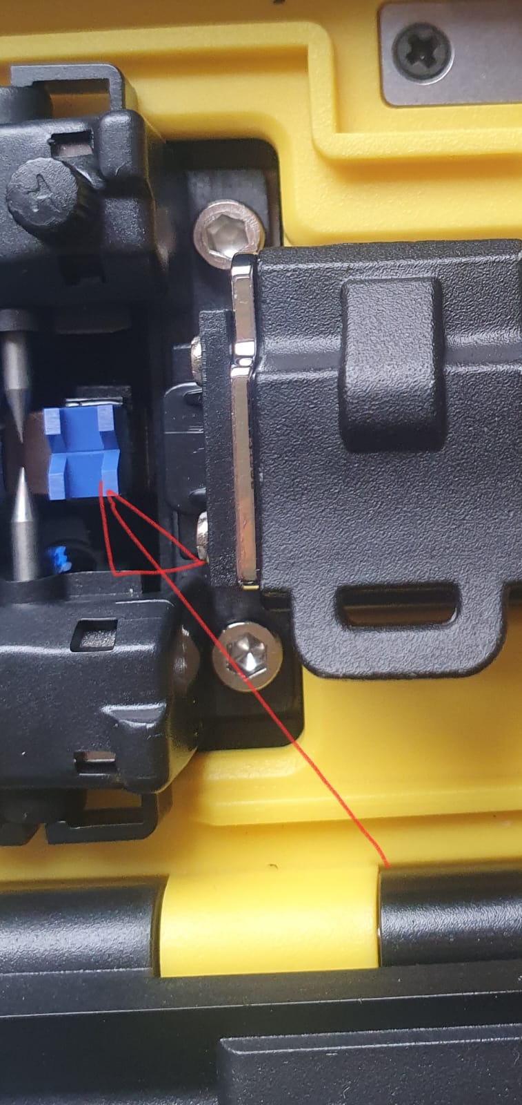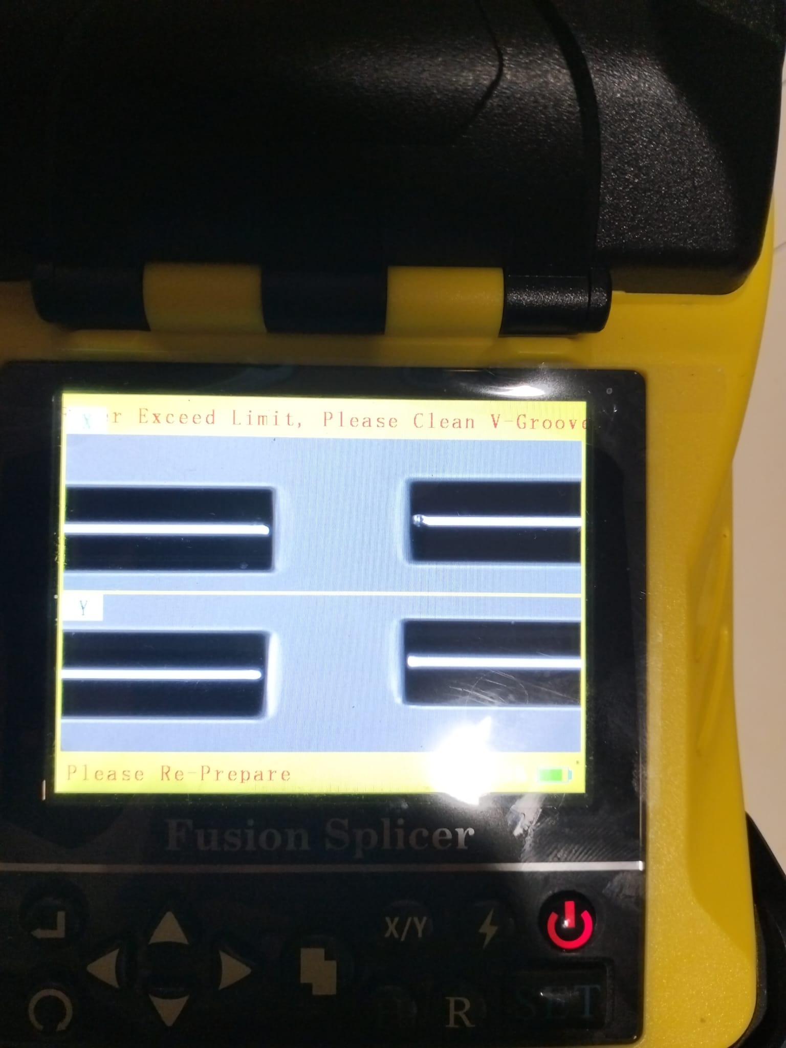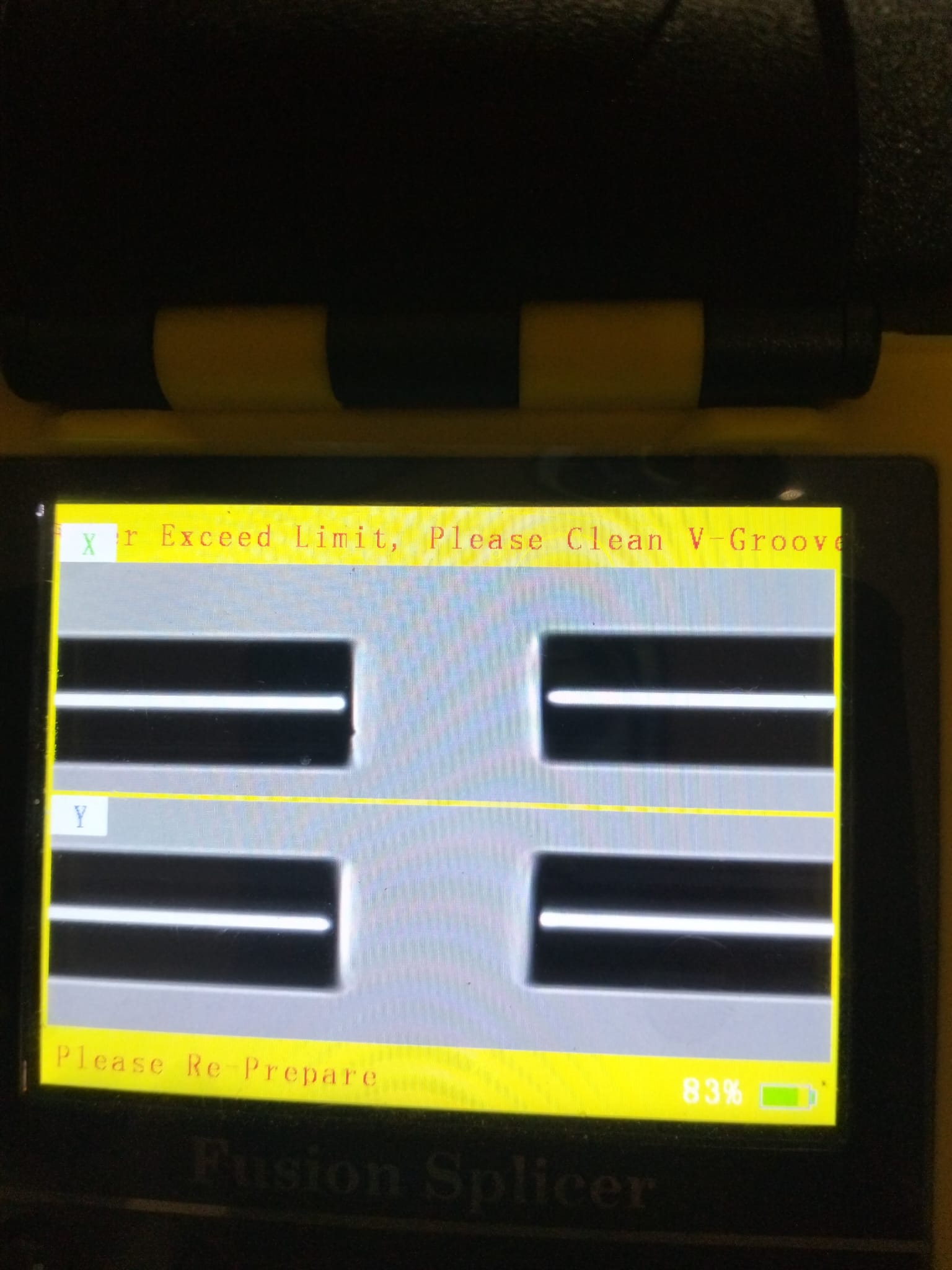 Una de las fallas comunes en el proceso de fusión es la suciedad acomulada de los conductos V-Groove de todas las fusionadoras. Las causas mas comunes cuando se trabaja en campo es la contaminación, lluvia, cortes de fibra limpiados a mano o la fata de una herramienta adecuada que deje residuos que impiden el correcto deslizamiento de la fibra por los canales V-Groove. Los canales V-GROOVE se pueden identificar en la mayoria de los modelos por su color azul y porque son los encargados de conducir el alineamiento de la fibra empujada por los motores de fusión hasta el punto de fusión de los electrodos. Esos canales deberán estar limpios en todo momento y no ofrecer resistencia al desplazamiento de la fibra durante el proceso de fusión. Si en tu fusinadora aparece el Error Exceed Limit , Please Clean V-Groove, deberás auxiliarte de la brocha de limpieza y de la botella de aire seco manual para limpiar con suavidad el canal. Podrás auxiliarte también de un bastoncito con alcohol para limpiar el canal desde los electrodos hacia la parte contraria , nunca tocando los electrodos. En todo momento con la fusionadora apagada o sin bateria para evitar tocar nada durante el proceso con la fusionadora en marcha.
